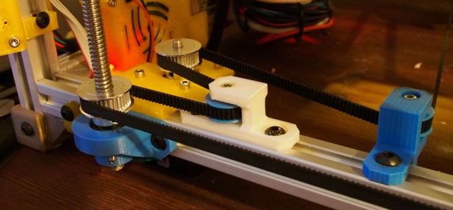 A common approach to fixing this problem is to go for two z-axis motors, just like with the hypercube evolution , and this is how I used to have the printer set up. The leadscrews in this design (two of them) are electrically coupled, which means that the electronics is responsible for keeping them in sync. If they get out of sync then the bed won’t be level anymore which is bad. I’ve taken an alternate approach, to combat against skipped steps from either motor, which could be more likely under the higher loads of CNC milling. Rather than electronically coupling the axes, I’ve mechanically coupled them using a single belt, arranged in a loop, and powered by one motor. This means that if the drive motor does skip then all the leadscrews will stall together and the bed will remain flat.
