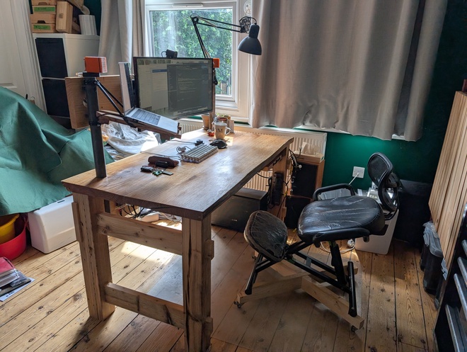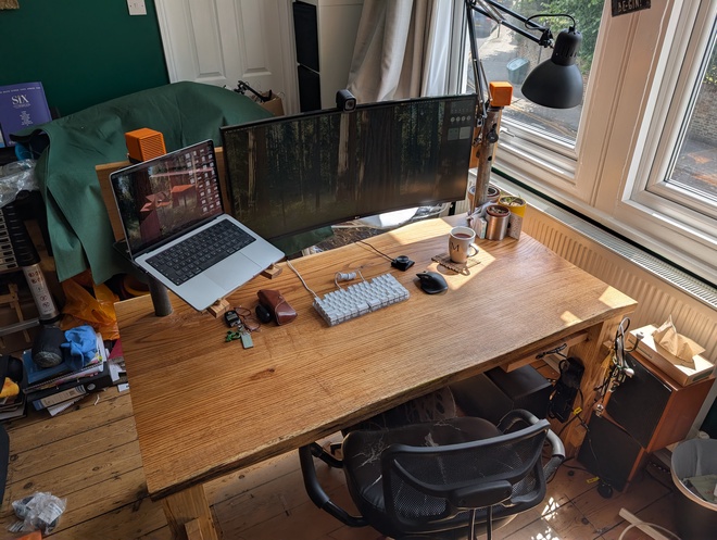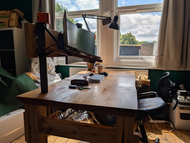 This positions the monitor at exactly the right height and distance, and again, all the cables route along the back of the scaffold plank and then down through the scaffold poles and under the desk. The monitor appears to float above the desk surface, which looks great and means I can use the full depth of the desk for work.