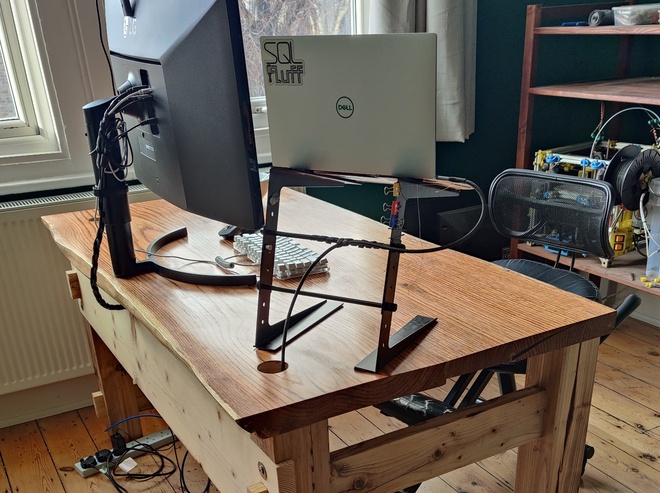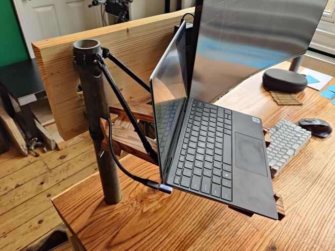 I designed a simple angled stand that bolts directly to the wooden backplane. The clever bit is the cable management - a USB-C cable runs down through one of the scaffold poles, emerges underneath the desk, and connects to a hub. This means the laptop gets power and data without any visible cables running up the back.