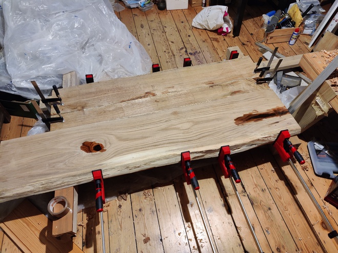 To join the two slabs, I needed them to be as flat as possible where they met. After carefully planing the joining edges, I did a test fit and then glued them together using wood glue, joining biscuits and plenty of clamps. The key here was to work quickly once the glue was applied, and to make sure everything stayed flat and aligned whilst the clamps were tightened. While I’d originally intended this to be just two slabs joined, one of them had a crack down the middle, and I wasn’t going to get quite enough width while still avoiding that crack. In the end I opted for three sections, two edges with their original edge, and a middle section planed on both sides.