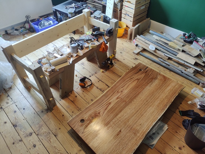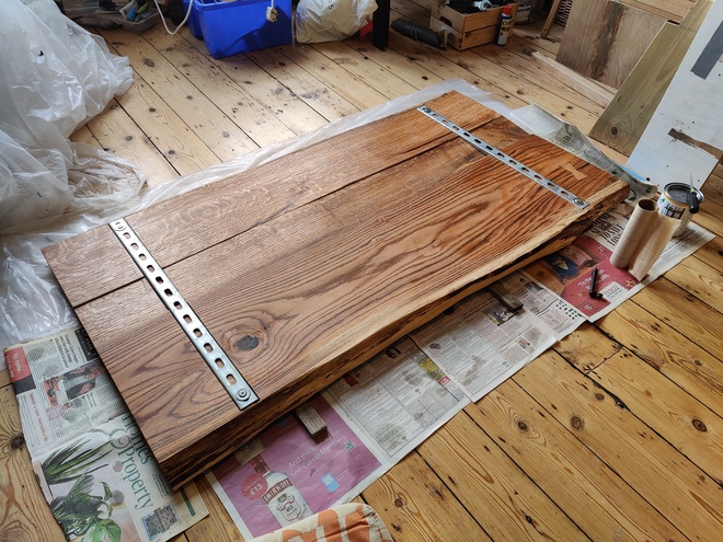 The plan was to join two oak slabs side-by-side to get the depth I wanted, reinforce them from underneath with metal bars, and then attach leg frames at each end. A removable cross piece at the back would provide additional stability and also serve to hide cabling.