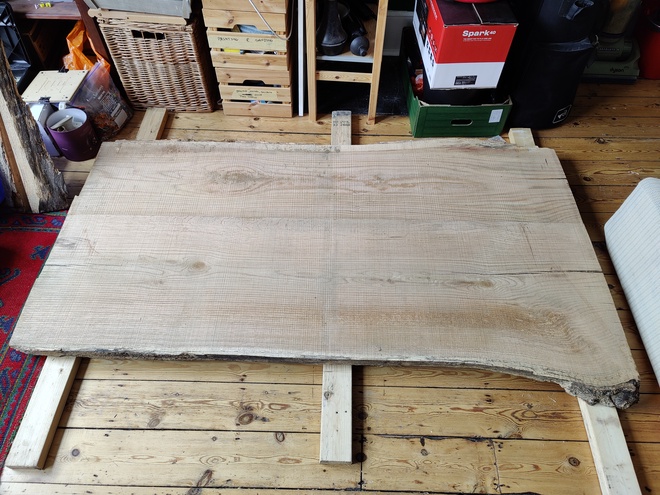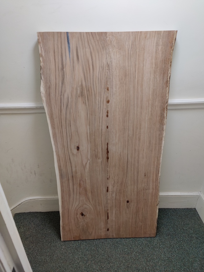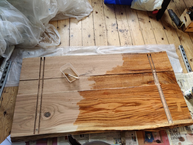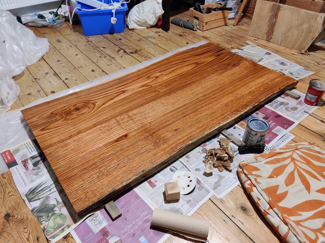 Oak being a natural material, there were various small cracks, voids and imperfections that needed filling. I used clear epoxy resin for this, applying it carefully to avoid making it too obvious. For some of the larger features, I added wooden bowties - both for structural support and as a decorative element (and partly to see if I could!). Annoyingly, when trimming the slabs to deal with the crack that I found (as mentioned above), the bowtie ended up best positioned on the underside and also had one end trimmed off. It’s job is structural so that’s theoretically fine, but it is a shame that it isn’t visible during use.